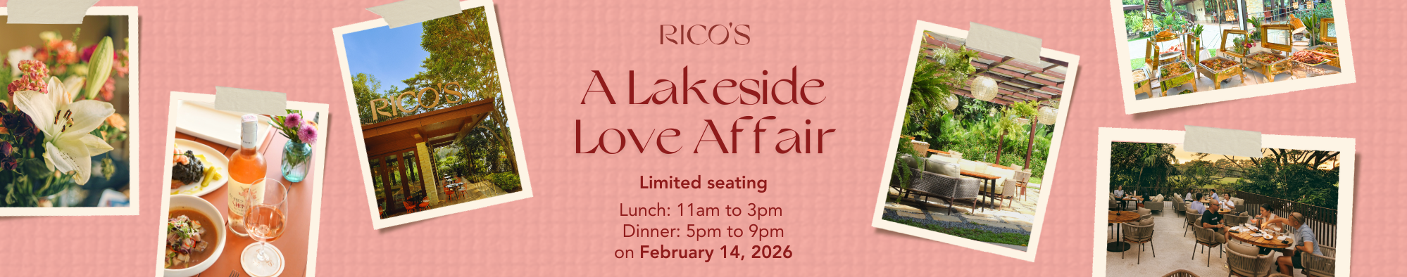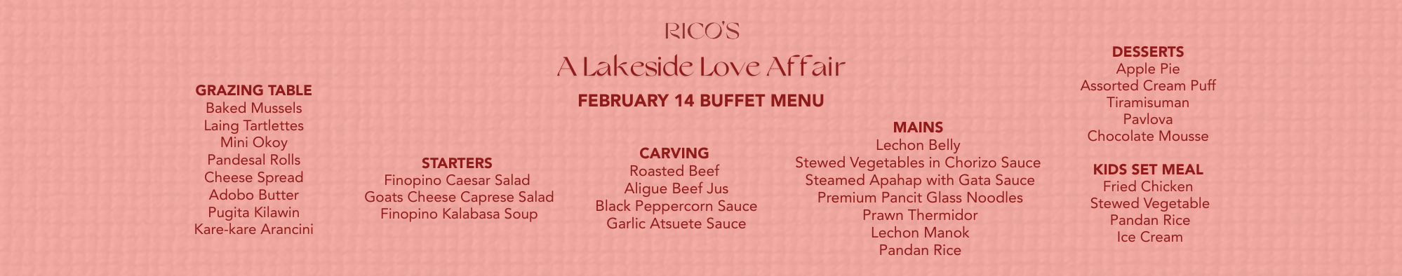 Find your lakeside sanctuary on Valentine's. Bring the whole family to Rico`s for a buffet experience set against the tranquil background of the lake.